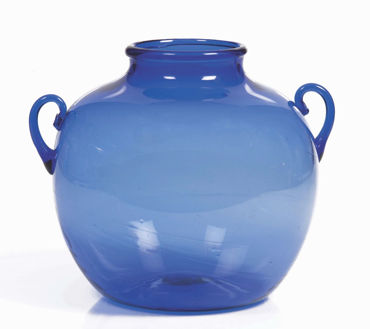 Vaso in vetro soffiato zaffiro con anse applicate. Altezza cm 20