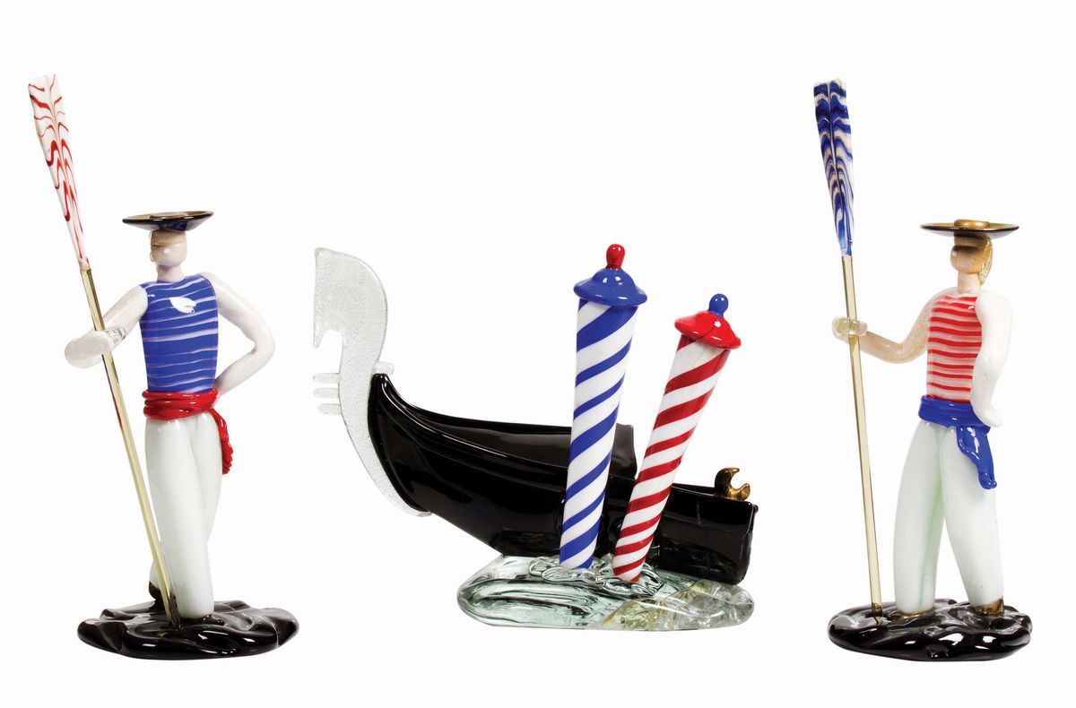 Centrotavola formato da due figure di gondolieri e una gondola in vetro policromo. Gondolieri altezza cm 27,5; gondola altezza 25, lunghezza 34 e larghezza 15