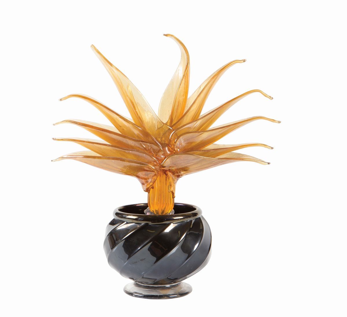 Scultura raffigurante pianta grassa in vaso, vetro soffiato arancione con piede e orlo applicati. Vaso in vetro nero fortemente iridato. Altezza cm 33; larghezza cm 25,5