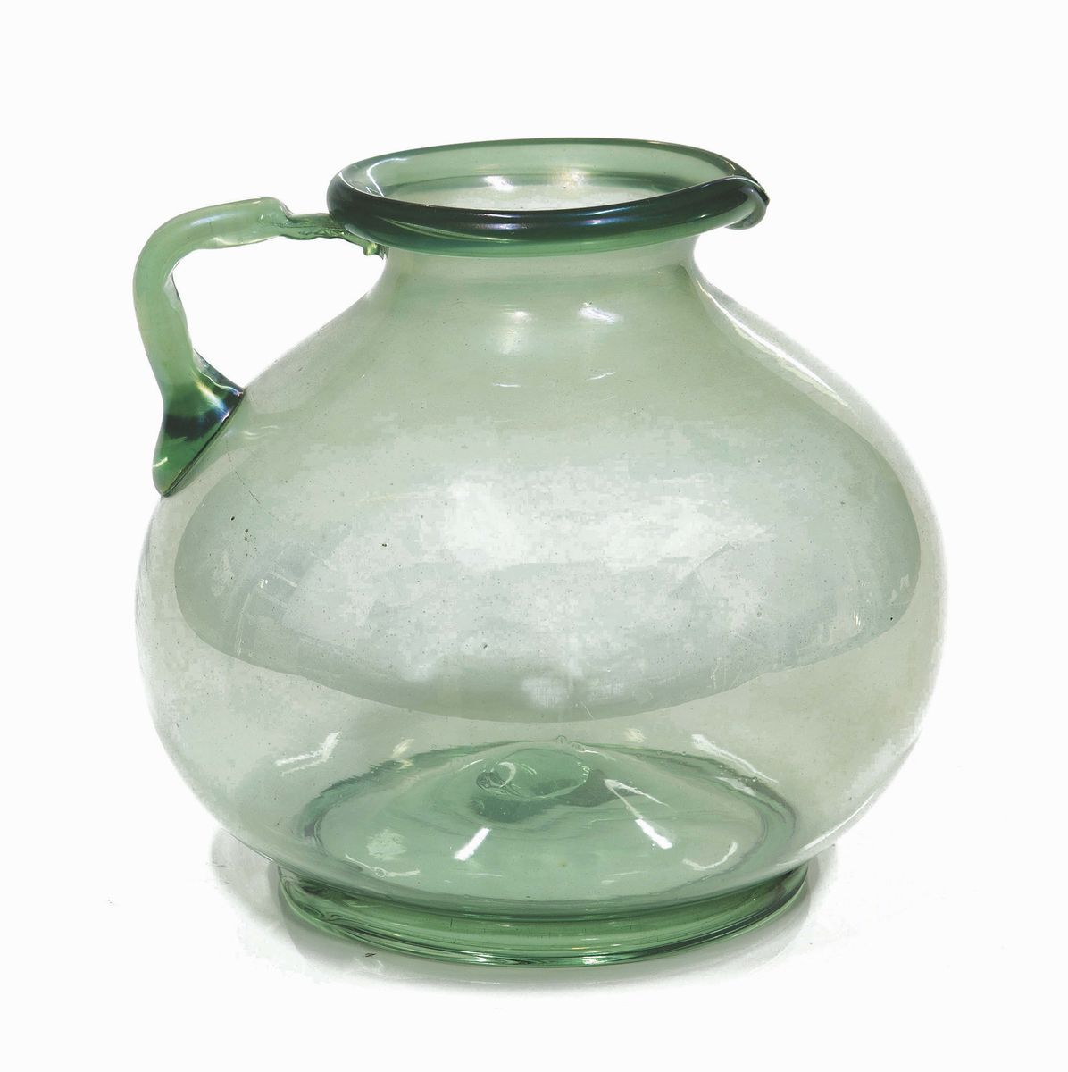 Vaso a caraffa in vetro soffiato verde iridato con orlo, ansa e piede applicati. Altezza cm 20