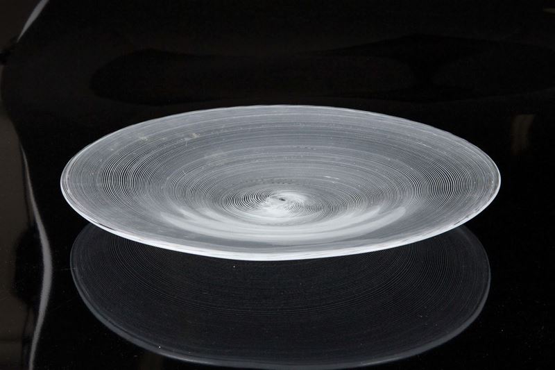 Piatto ovale in vetro soffiato a mezza filigrana lattimo.Dimensioni cm 38x45; altezza cm 5