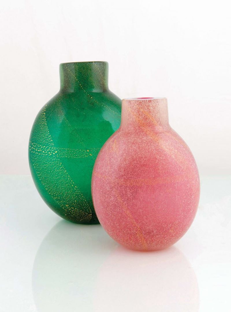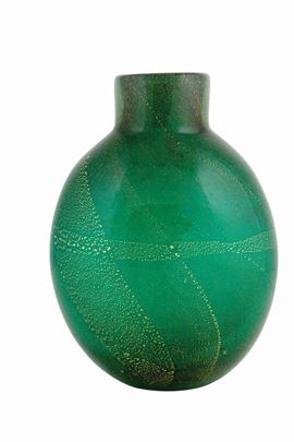 Eccezionale vaso in vetro sommerso verde con inclusione di foglia d'oro. Altezza cm 27