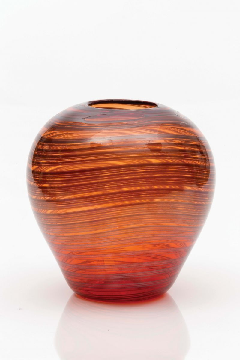 Vaso serie a Fili in vetro soffiato con decoro a sottili canne in vetro multicolori, ambra e marrone. Altezza cm 22; diametro cm 22