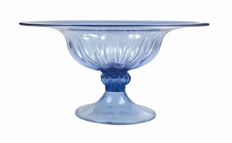 Grande coppa costolata azzurra su alto piede in vetro soffiato azzurro. Altezza cm 25; diametro cm 50