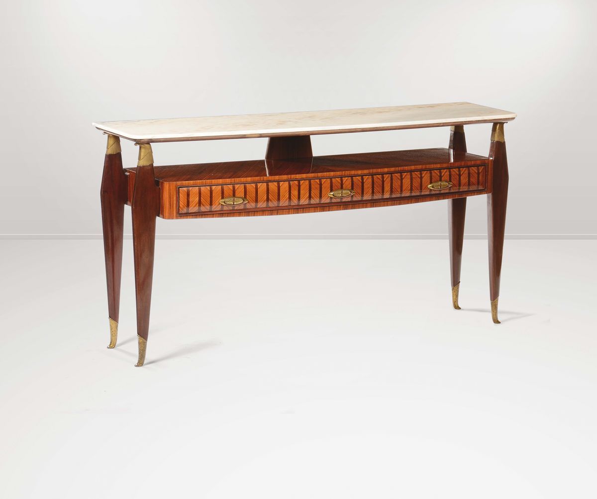 Consolle in legno con piano in onice e dettagli in ottone.