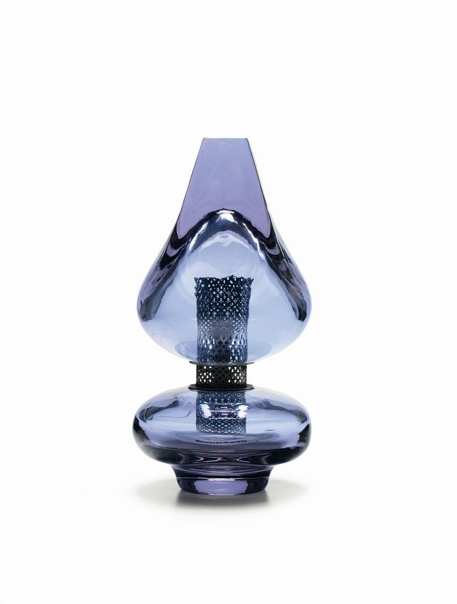 Lampada da tavolo mod. 14092 in vetro di Murano colorato e struttura in metallo nichelato.Prod. Seguso, Italia, 1960 ca.cm. 25x50