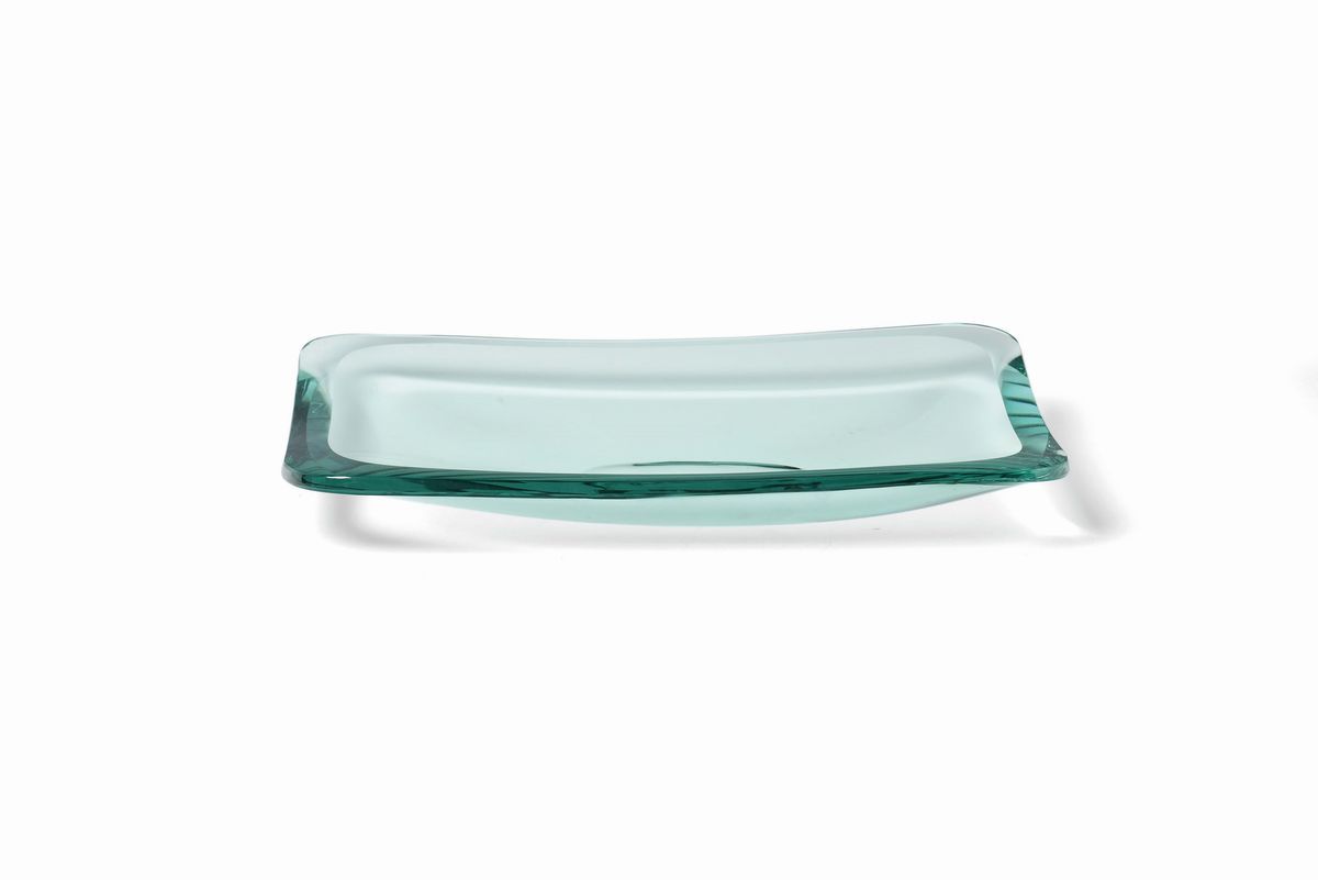 Due svuotatasche in cristallo colorato, curvato e molato.Prod. Fontana Arte, Italia, 1950 ca.cm 21x5 e cm 42x24x7