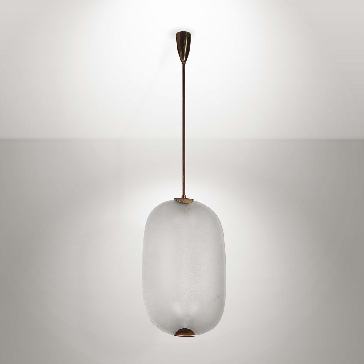 Lampada a sospensione con struttura in ottone e diffusore in vetro curvato e satinato.Prod. Fontana Arte, Italia, 1950 ca.cm. 24x92