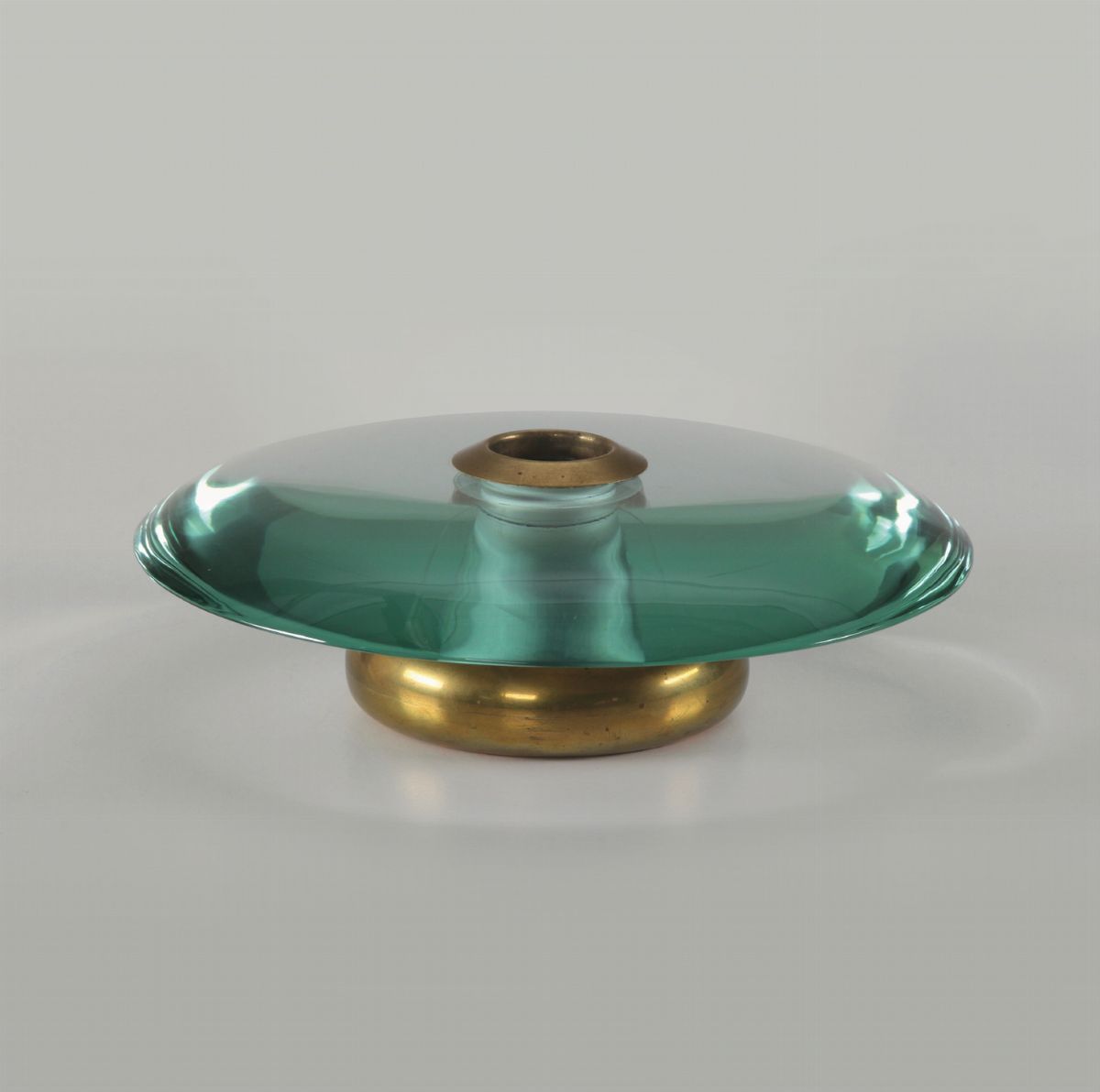 Portafiori in vetro di forte spessore molato e ottone lucido.Prod. Fontana Arte, Italia, 1950 ca.cm. 28x10