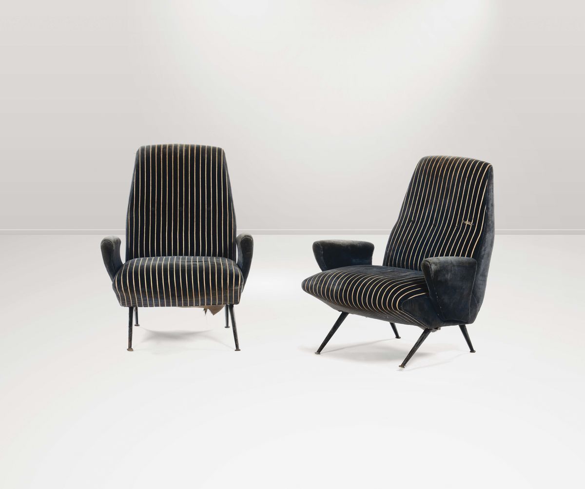 Coppia di poltrone con struttura in metallo e rivestimento in tessuto.Prod. Italia, 1950 ca.cm. 65x70x82