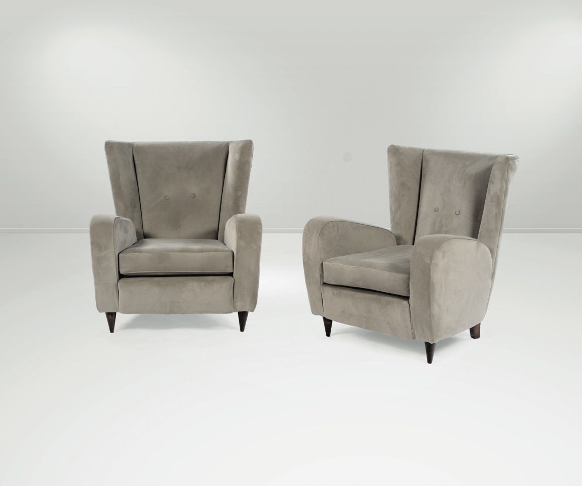 Coppia di poltrone con struttura in legno e rivestimento in tessuto.Prod. Italia, 1950 ca.cm. 80x70x85