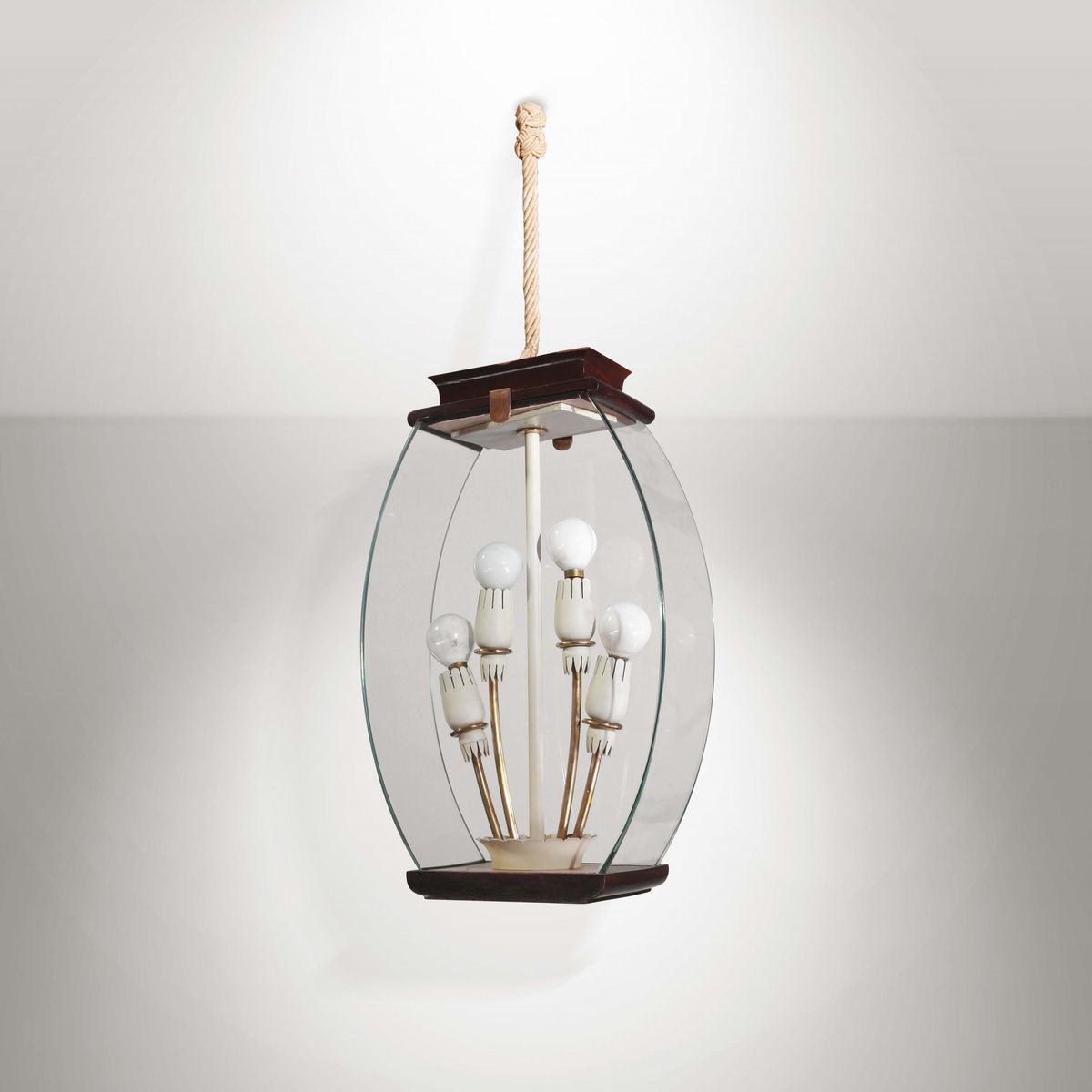 Lampada a sospensione in ottone, vetro e legno laccato. Dettagli in metallo.Prod. Fontana Arte, Italia, 1930 ca.cm. 30x46x12
