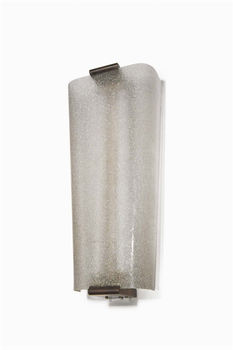 Coppia di appliques con struttura in ottone lucido e diffusore in vetro stampato e curvato. Prod. Fontana Arte, Italia, 1930 ca.cm 68x32x17