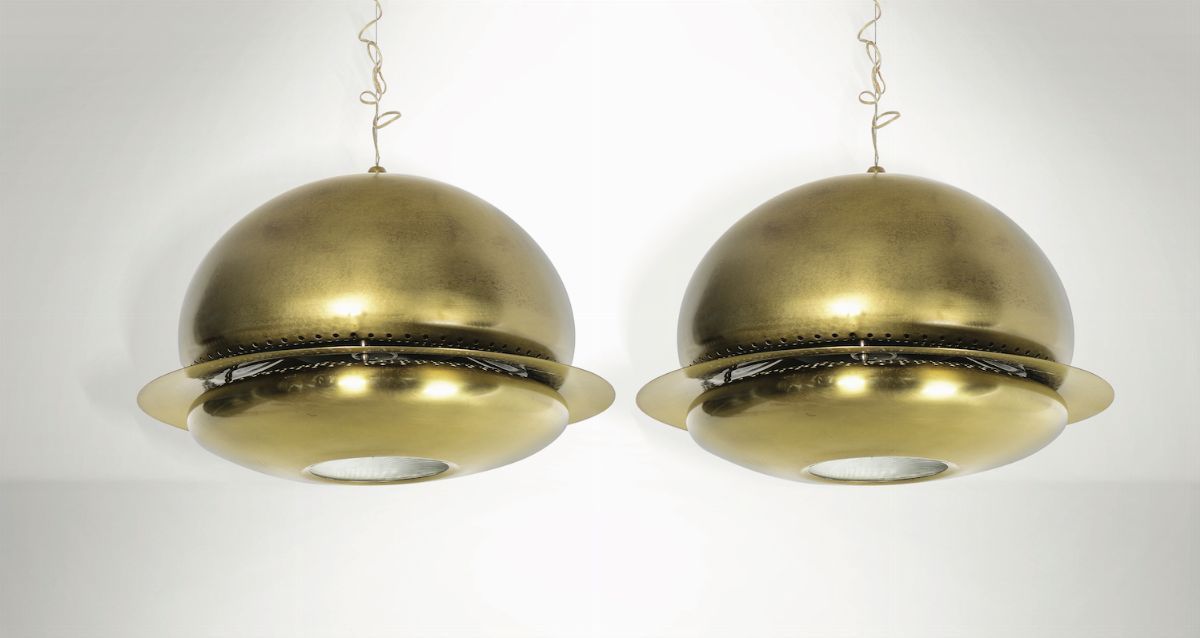 Coppia di lampade da sospensioni Nictea in metallo e vetro.Prod. Flos, Italia, 1961cm. 48x28