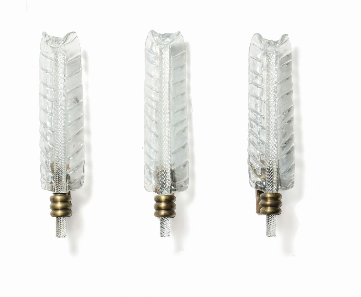 Tre lampade da parete in vetro di Murano con sostegno in ottone lucido.Prod. Venini. Italia 1930 ca.cm. 10x39x8,5