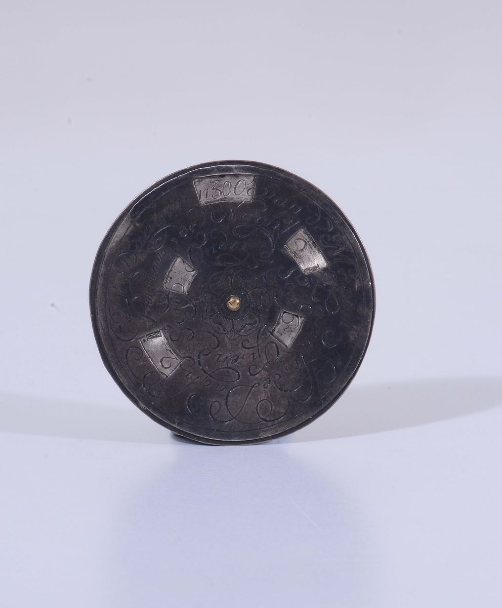 di forma circolare, ogni lato con placca rotante, di cui una con giorni della settimana ed inciso daagen de weeks e Almenack, sull'altro lato cinque aperture per diverse misurazioni con ulteriori iscrizioni, diametro cm 4,7