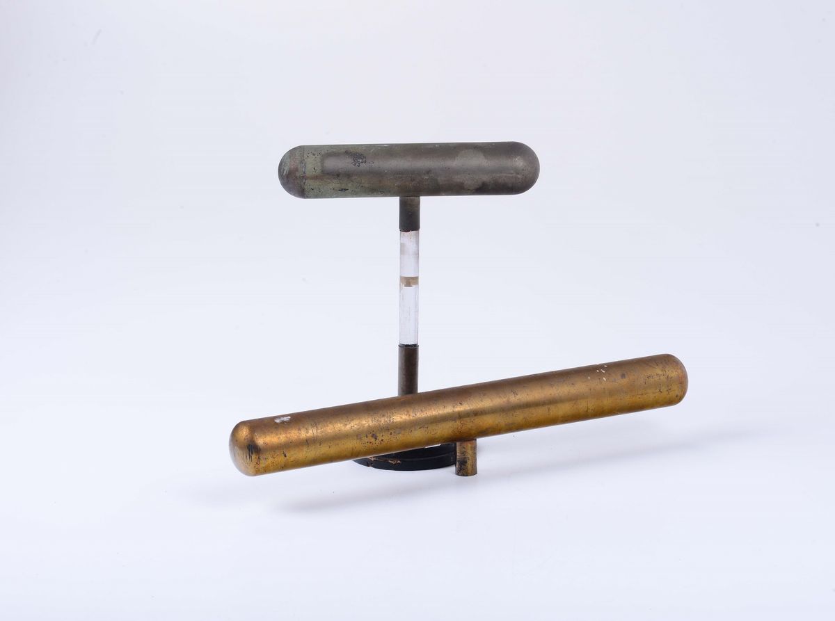 con le estremità semisferiche, hanno fori laterali per attacchi del filo di sospensione delle palline di sambuco; con isolatore in vetro e base in legno tornito (in uno mancanti).Dimensioni cilindri:Diametro cm 4,2 / 3,7 Lunghezza cm 38 / 32