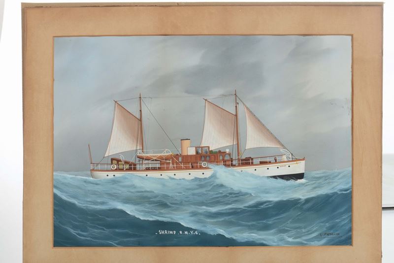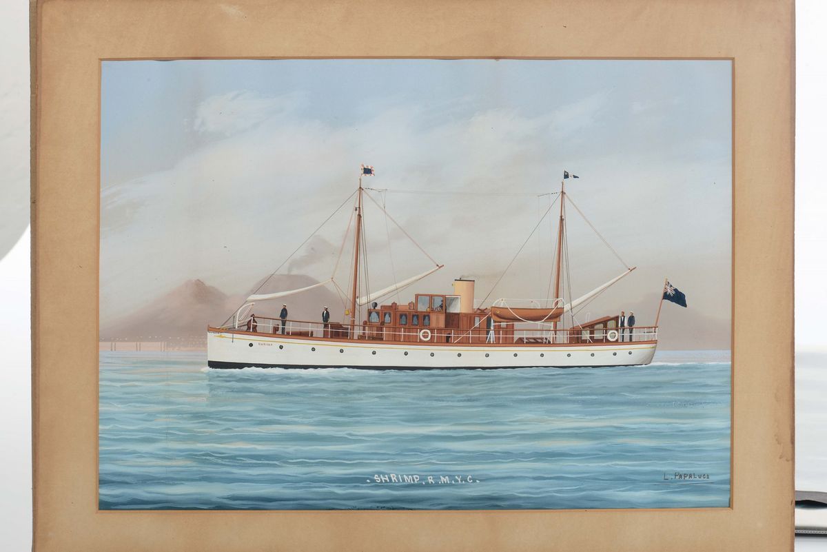 Luca Papaluca (1892-1934) Ritratto dello RMYC Shrimp nel golfo di Napoli e in navigazione in mare aperto