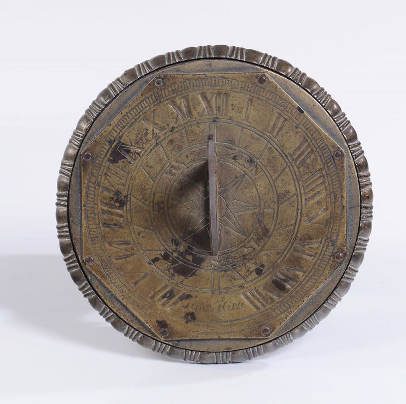 tracciato orario da IIII a XII a VIII, inciso a bulino con belle forme dei numeri romani, tra i quali la scala è indicata con tracciato di 5 minuti in 5 minuti con elevazione dell’indicazione delle mezze ore. La ricchezza della base tornita fa della meridiana un complesso strumentale di alta decorazione che si completa con le informazioni scientifiche temporali.Diametro max – 24 cm.; Altezza 38,5 cm..