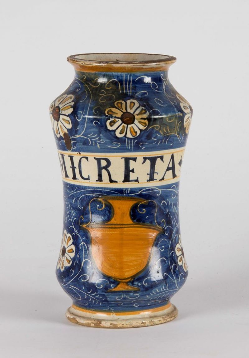 L’opera presenta corpo cilindrico, slanciato e leggermente rastremato nella zona mediana; la base è carenata e piatta, con accenno di piede; la spalla del vaso stringe verso una bocca a breve colletto estroflesso. Al centro della zona mediana frontale è dipinto un’anfora che richiama nella forma analoghi oggetti realizzati in metallo, da cui dipartono tralci graffiti “graffiti”, su fondo blu, terminanti con una corolla; sopra al vaso è dipinto un nastro orizzontale su cui è tracciata la scritta farmaceutica “MICRETA”, in caratteri capitali. Sotto la base si notano dei segni graffiti nel “biscotto”. Dipinto in arancio, blu, giallo e rosso. L’albarello appartiene ad una serie di vasellami la cui veste decorativa, classificata da Fausto Berti come “blu graffito tardo”, attorno alla metà del ‘500 a Montelupo registra un particolare sviluppo, specie sui vasi da farmacia di cui si conoscono albarelli di forma simile, ma di diverse capienze, vasi globulari biansati e brocche (utelli)1. L’omogeneità tecnico- decorativa che caratterizza questi vasellami montelupini, decorati a fondale in “blu graffito”, alimenta l’ipotesi che in origine appar- tenessero di un unico corredo da spezieria, che Berti include tra i corredi “con simboli e stemmi di richiamo o destinazione incerta” e denomina “del Vaso”2, del quale facevano par te, ad esempio, gli albarelli della collezione Adda3, collezione Serra4, del Museo di Faenza5, del Bargello di Firenze6, del Museo del Vino di Torgiano, del Philadelphia Museum of Art7, delVictoria and Albert Museum di Londra8, un vaso globulare biansato già nel Museo Artistico industriale di Roma9 ecc. Con questa raffinata veste in “blu graffito”, sono note altresì delle grandi coppe su piede, nelle quali questa decorazione, di bell’effetto, fa da sfondo a figure, busti di “belle”, animali ecc.10. Circa la scritta MICRETA, riferita al contenuto, è evidentemente forma corrotta per “MICLETA”, medicamento che nella “Farmacopea Universa- le del Lemery, che riporta il medico Nicolò Salernitano, “Significa medicamento per il flusso di sangue, e per quello delle morici. Si dà codesto nome ad una composizione, astringente” 11. Segnaliamo inoltre che la stessa dicitura “MICHE- TA” è indicata su un albarello di Deruta, in raccolta privata, datato “1507”. 1MARINI 2014, scheda 80 a, b, pp. 152-153. 2BERTI 2010, pp. 179- 181. 3RACKHAM 1959, fig. 165, n. 575. 4LA PORTA D’ORO 1964, 129- 131, n. 23. 5BOJANI- RAVANELLI GUIODOTTI- FANFANI 1985, scheda n. 525, p. XLIV e p. 209. 6Donazione Pillitteri (ALINARI- SPALLANZANI 1997, scheda 3-4, pp. 14- 16). 7WATSON 2001, scheda 27. 8RACKHAM 1940, n. 356. 9BERTI 1999, pp. 143- 145, figg. 80- 85; BERTI 2008, pp. 318- 319. 10RAVANELLI GUIDOTTI 1990, pp. 70- 72, schede 35 e 36. 11LEMERY 1742, p. 20. Bibliografia L’opera è apparsa sul mercato nel 1982 (CHRI- STIE’S 1982, lotto 323) ed è pubblicata in: MORLEY FLETCHER- McILROY 1984, p. 45, fig. 5; Ceramiche varie, maioliche, porcellane italiane 1984, p. 78, fig. 347.