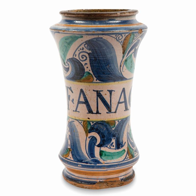 Albarello a parete cilindrica piuttosto rastremata sulla zona mediana, base carenata con piede accennato, bocca ampia con orlo appena estroflesso. Sulla zona mediana, all’interno di un ampio cartiglio orizzontale, è tracciata l’indicazione farmaceutica “CONF. ANACARDA”; sulla restante superficie si dispongono delle foglie accartocciate rincorrentesi. Dipinto in arancio, blu e verde. Quest’opera, come la precedente, nella sua veste decorativa è tipica espressione della vasta produzione di Montelupo che assume una vasta standardizzazione produttiva nella prima metà del ‘500. Il motivo della “foglia accartocciata” si sviluppa all’interno del repertorio floreale-gotico italiano, particolarmente attraverso le cornici della minitaura settentrionale italiana, ed è composto essenzialmente da una o più foglie che tendono a ripegare su se stesse, disposte solitamente attorno ad un talamo centrale, e spesso in associazione con minuti motivi di spiralette, girali, puntini, rosette di gusto moresco1. Fausto Berti suggerisce di denominare tale classe decorativa “floreale evoluta”, che si manifesterà in forme simili anche nella sua fase più matura, registrando il suo declino dagli anni ‘40 del secolo2. Il medicamento indicato sul cartiglio si riferisce alla “Confezione anacardina”; poiché si reputava che gli anacardi potessero aiutare a recuperare e giovare alla memoria, era detta anche “Confettione dei Sapienti” 3. 1RAVANELLI GUIDOTTI 1988, pp.100- 103. 2BERTI 1998, p. 114. 3DONZELLI 1704, p. 257.