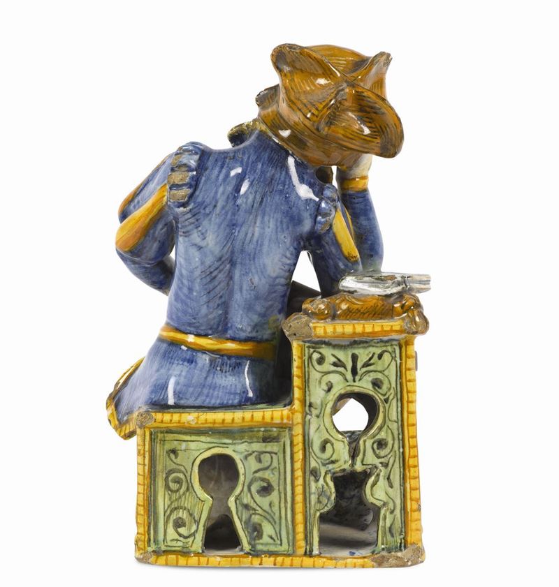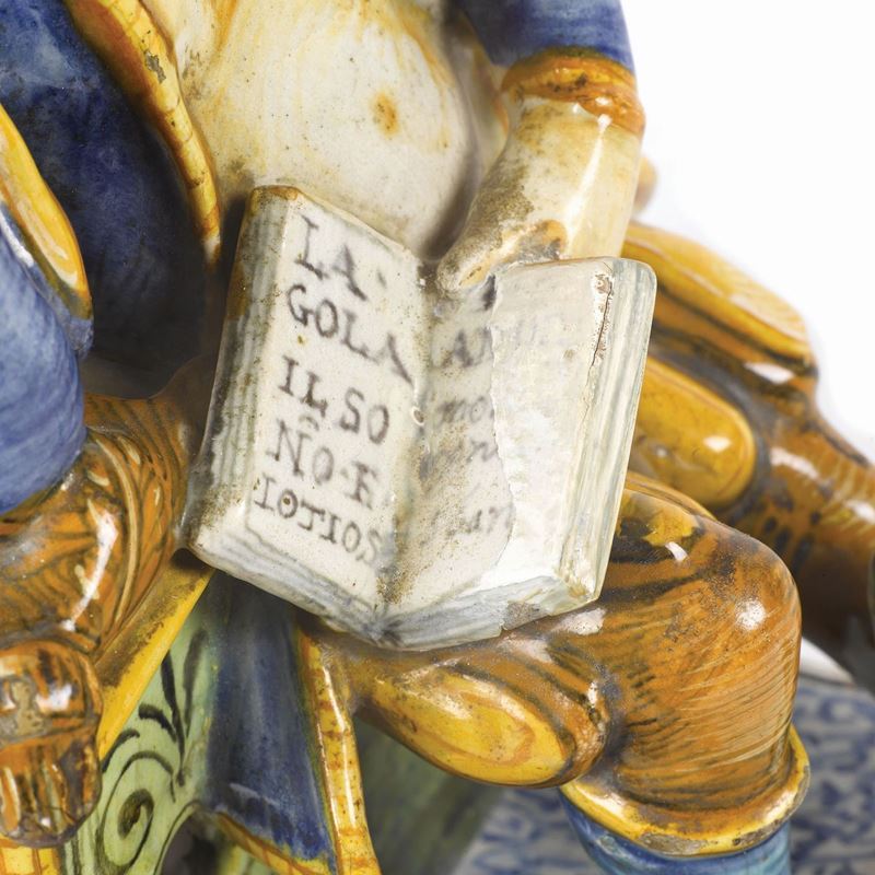 Composizione plastica, a tutto tondo, su base rettangolare, con il portainchiostro a foggia di piccolo vaso globulare, baccellato e marmorizzato; il tema centrale si basa sulla figura di un personaggio con cappello e in abiti cinquecenteschi, seduto su uno sgabello accanto ad un tavolino; è colto in atto di poggiare il gomito del braccio destro sul piano del tavolino, che ospita un cuscino e un libro; l’uomo inoltre con la destra stringe un volume aperto, sulla cui pagina sinistra cui sono tracciate le parole “LA/ GOLA/ IL SO/ N(N)O. E/ LOTIOSE”, mentre nell’altra pagina a fianco altre parole risultano leggibili solo in parte, cioè “AN (NO) DEL/ mo (ndo)/ ogn (i virtù)/ sban (dita)”. Completa questa deliziosa scenetta un cane accovacciato in primo piano, che con la zampa anteriore è in atto di richiamare l’ attenzione del personaggio. Dipinto in piena policromia. Pregevole composizione di soggetto allegorico, colto saggio della piccola plastica maiolicata dell’ultimo quarto del ‘500, che nasceva per lo più con un carattere privato, ovvero ad esclusivo uso di chi le aveva commissionate o ricevute in dono. Opere come questa sono solitamente assegnate alla feconda bottega urbinate dei Patanazzi, che nel corso dell’ultimo quarto del ‘500, oltre ai vasellami, si era specializzata in una vasta produzione di piccole plastiche come questa, con funzione di servizio da scrittoio (“calamaro”) o di guttatoio, come attestano i documenti urbinati, specie gli inventari del Palazzo Ducale1. Sono per lo più prive di data, ma almeno due vanno segnalate in funzione di riferimento cro- nologico: quella del Metropolitan Museum di New York, del “1584” 2, e il calamaio per il card. Baronio, la cui datazione si può porre nel momento della sua elevazione alla porpora romana, avvenuta il 5 maggio 15963. Segnaliamo una composizione maiolicata, della stessa bottega, con il medesimo impianto plastico, raffigurante un addestratore di orsi, in collezione privata4. Inoltre diversi sono gli elementi che rendono quest’opera una notevole testimonianza dell’epoca: ad esempio, il personaggio è così ben descritto nel suo abbigliamento da costituire un interessante documento di costume. Ancor più notevole si mostra la scelta del testo evocato sul libro che l’uomo tiene in mano, tarda eco del petrarchismo che aveva alimentato per decenni la cultura della maiolica italiana del ‘500 . Si tratta infatti del sonetto VI delle “Rime” di Francesco Petrarca, componimento che inizia proprio con “La gola e il sonno e l’oziose piume, hanno del mondo ogni virtù sbandita”: fonte indispensabile per completare la seconda parte incompleta dell’iscrizione dipinta nella pagina destra del libro stretto dal personaggio, divulgata anche da Cesare Ripa, nella sua “Iconologia”, ad vocem “Adulterio”, la cui prima edizione è del 15935 (d). 1SANGIORGI 1976, pp. 186- 195; NEGRONI 1998, pp. 112- 115. 2POOLE 1997, p. 405; WILSON- SANI 2006, p. 215. 3RAVANELLI GUIDOTTI 2006, scheda 16, pp. 94 e s. 4GARDELLI 1987m, scheda 66, pp. 154- 155. 5RIPA 1593, p. 13.