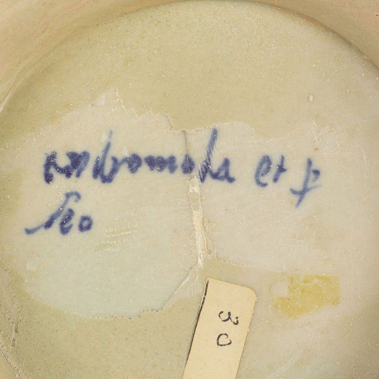 La coppa presenta umbone centrale, attorno al quale si dispongono delle baccellature a larghi ovuli, teminanti a smerlatura all’orlo; il piede è a parete svasata. Sul recto è istoriato a piena superficie il mito ovidiano di “Perseo e Andromeda” (OVIDIO, Met., IV, 665- 739). Andromeda è raffigurata al centro della composizione, ignuda e legata ad uno scoglio, mentre sta per cadere vittima sacrificale di un drago marino, qui dipinto a a sinistra della scena, mentre sul lato opposto è descritto Perseo, il giovane eroe greco in atto di sopraggiungere impugnando una lunga spada; in alto a sinistra è rappresentato Pegaso mentre sorvola il mare in corrispondenza del mostro. Il paesaggio è un ambiente marino africano, adatto ad evocare la terra della principessa etiope, con una palma in primo piano, una distesa marina, città in lontananza e monti all’orizzonte (a). Sul verso, al centro del piede, è tracciata la legenda, in corsivo e col blu, “andromeda et p (er)/seo” (b). Dipinta a piena policromia come abbiamo osservato in alcune opere precedentemente illustrate in questa sede (v. schede nn. 56-58), anche in questo caso siamo davanti ad un’opera che si può ascrivere alla mano del pittore che va sotto il nome di Andrea da Negroponte, legato alla bottega dei Picchi, con opere che si datano soprattutto tra il 1550 e il 1560. E’ maestro fecondo, che collaborò con la bottega durantina dei Picchi, che dipinge con grande disinvoltura, dotato di una sua personalità, con uno stile figurativo corsivo di grande prestezza di mano che non rispecchia più i canoni classicheggianti della miglior produzione urbinate, ma di certo sa evocare, come dimostrano le divertenti fattezze di Pegaso e del drago, i miti ovidiani con vivace vena fabulistica: la stessa che egli manifesta su un’altra “crespina”, di identica iconografia a questa in esame, del Museo di Braunschweig, che il Negroponte però modifica nella legenda, ovvero “Angelica ligata al sasso” 1. 1LESSMANN 1979, scheda 116, p. 155; v. le altre “crespine” alle schede nn. 119, 120, pp. 156-7.