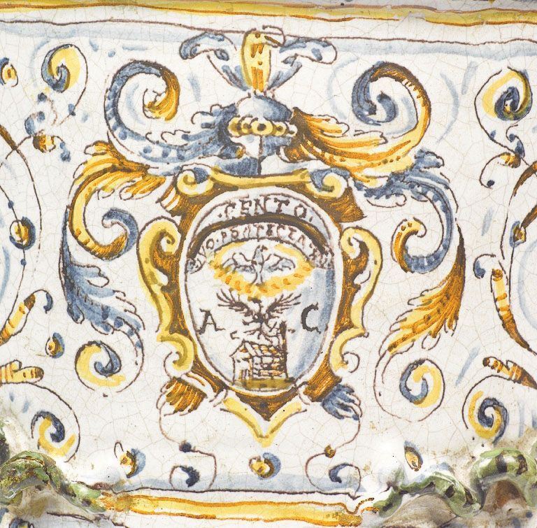 L’opera, sebbene di grandi dimensioni, mantiene l’impianto tipico dell’albarello “a rocchetto”, ossia il corpo centrale cilindrico, bombature alla spalla e verso il piede, che è ampio e svasato; anche la bocca è ampia e presenta orlo estroflesso; il vaso è dotato di prese laterali, a tutto tondo modellate a foggia di arpie con estremità serpentiformi. Sull’intera superficie si dispone una decorazione “a raffaellesche” con mascheroni alati, girali fogliate e fasce ad ovuli al piede e alla bocca. Sulla zona mediana delle due facce è ripetuto lo stemma della famiglia Chiesa (o dalla Chiesa) di Cento, con scudo accartocciato, svolazzi e cimiero. Dipinto in arancio, blu, bruno, giallo e nero. Nonostante presenti diverse lacune integrate, che però fortunatamente non intaccano l’aspetto araldico, quest’opera costituisce comunque un bel documento. Essa infatti figurò alla storica Mostra dell’antica maiolica ligure, che si tenne a Genova nel 19391, in cui si ipotizzava fosse lavoro urbinate. La destinazione di opere come questa, di grandi dimensioni, la esplicita un vaso di identica foggia, decorato “a ricamo”, del Museo di Faenza, su cui è la scritta “Mustarda. Fina”, che nei corredi delle spezierie aveva prevalentemente finalità “da mostra”, posto pertanto a coronamento di lesene o mensole2 , in questo caso più che mai essendo assente la scritta farmaceutica. Da un punto di vista decorativo, la “raffaellesca” è distribuita secondo un impianto distributivo simmetrico, così interpretate dalla metà del ‘500 fino alla metà del secolo successivo ancora con la sensibilità dello stile “compendiario” dei “bianchi” di Faenza, ossia un repertorio agile, minuto, diramato e arioso, con girali, testine o mascheroni alati, ecc. Innumerevoli i campioni integri che offrono le collezioni del Museo faentino, che oltretutto conserva anche notevoli testimonianze frammentarie, sia di albarelli con le stesse arpie plastiche sia decorati con simili “raffaellesche” frutto di recuperi sul territorio. Circa l’aspetto araldico dell’opera, le fonti storiche attestano che la famiglia Chiesa veniva da Bologna, come peraltro conferma il Canetoli nel suo Blasone bolognese, 1791- 17953, che la include tra le “Famiglie nobili e cittadine”. I blasonari di Cento (c, d) tramandano che i Chiesa erano “Cittadini sussistenti nel 1600” 4, riferimento cronologico interessante perché quasi coincidente con la data che si legge all’interno di una delle due versioni dello stemma, “1601”; oltretutto la versione maiolicata riporta anche il motto, trascritto quasi fedelmente dai modelli araldici centesi, ma che in capo aggiunge l’indicazione della città,“CENTO”, e ai lati della figura araldica “parlante” della chiesa, pone le iniziali “A” e “C”, riferibili ad un componente della famiglia Chiesa (e). 1 GROSSI 1939,Tav. XVI. 2 RAVANELLI GUIDOTTI 1996, pp. 536- 537, scheda 164. 3 CANETOLI 2006,Tav.23, n. 362. 4 MONTEFORTI 1999, p. 32, c. 40. Francesco Antonio Bagni, nel suo Armi o stemmi gentilizi delle famiglie di Cento, del 1719, così descrive l’araldica della famiglia:“Si accordava con il suono del cognome di questa famiglia l’arme di essa, che era un edificio di chiesa con la facciata e porta rivolta a destra e con il suo campanile nel fondo e sopra il detto edificio a sinistra; et il campo era d’aria. I moderni aggiunsero sopra il tetto del edificio, che veniva ad essere come nel capo dello scudo, una colomba bianca radiata con l’ali aperte come si figura lo Spirito Santo. Era la casa loro nella Viazzola Nova o di S. Caterina a mezzo giorno, la prima doppo un muro senz’edificio che si vede passato il tratto di pochi passi lasciata la prima casa di detto vicolo; et in essa, e in un soprafocolare, et in un bel fregio dipinto per mano del celebre Guercino, si vedeva espressa” (BAGNI ed.2000, p. 158). Bibliografia L’opera è citata in: RAVANELLI GUIDOTTI 1996, p. 536.