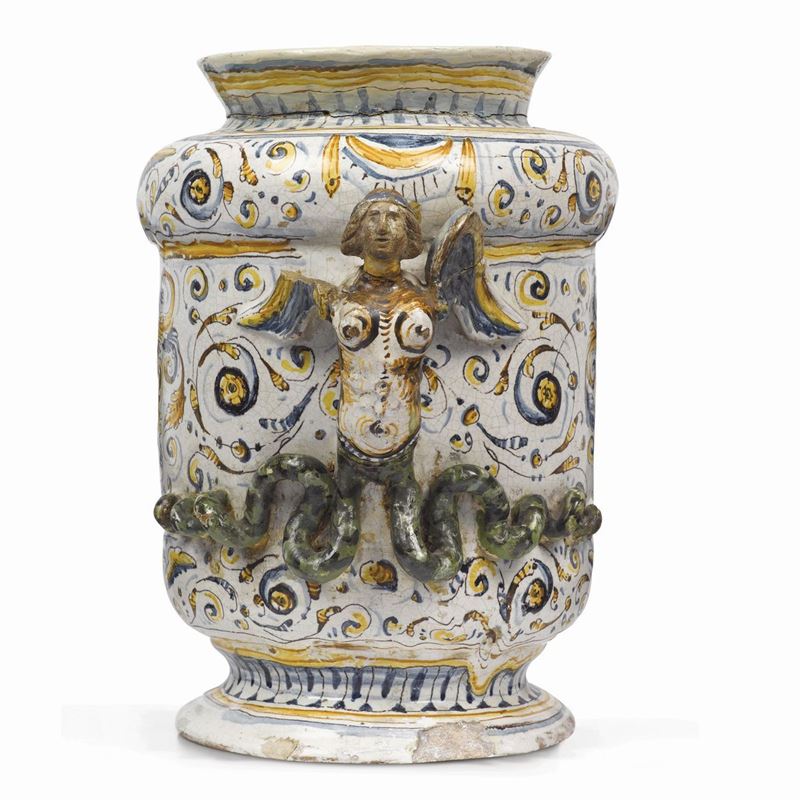 Maiolica Altezza cm 32; diametro piede cm 19; bocca cm 16,5 Le arpie hanno la testa rifatta in cotto e lacune integrate alle ali e alle code; in cotto risulta pure il colletto alla bocca. Provenienza: già raccolta Nino Ferrari di Genova