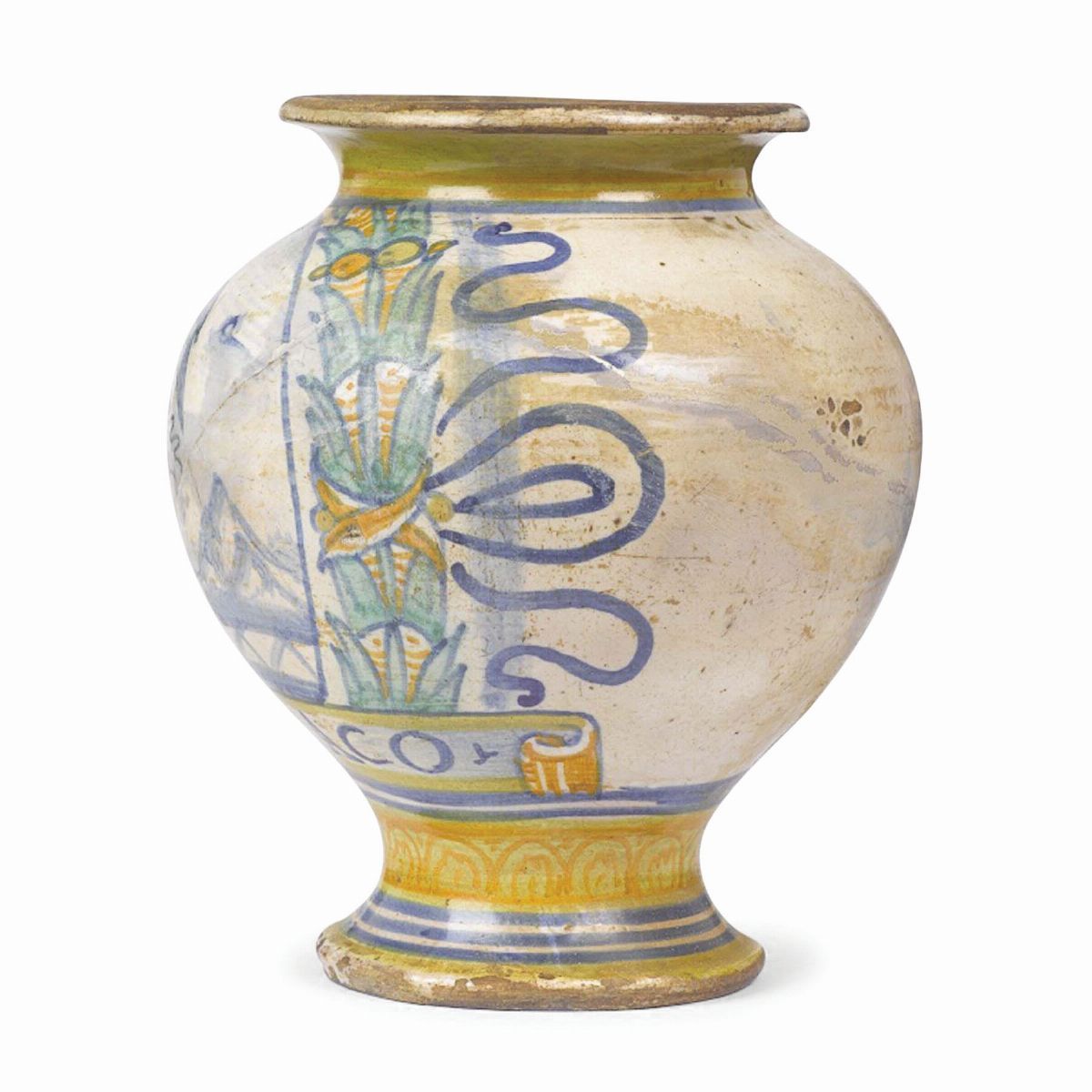 L’opera è pendant di quella esaminata alla scheda n.78. Anch’essa è tipica foggia da farmacia, con corpo ovoidale, ad alto piede slanciato, svasato e con orlo a spigolo; la bocca è ampia e a bordo esproflesso. Sulla zona frontale, all’interno di un ampio medaglione circolare, delimitato da un festone di foglie e frutta, e legato ai lati da nastri, è raffigurato un amorino, che con entrambe le mani stringe una corona; è in atto di incedere verso una casa di tipo rustico, posta a sinistra della composizione, su una strada con lastre delineate per linee diagonali; all’orizzonte sul lato opposto è dipinto un picco montuoso e in alto due nuvole appena accennate. Verso il piede si dispone un cartiglio orizzontale, con estremità arricciate, che porta la scrittaV°. EGITTIACO; al piede è tracciata una fascia con ovuli e filettature. Dipinto in arancio, blu, giallo e verde. Vale quanto abbiamo commentato per l’opera precedente, cioè che questo piccolo vaso destinato ad contenere un unguento, fa parte di una serie di piccoli contenitori, compresi in un noto corredo da farmacia, oggi disperso in varie collezioni pubbliche e private. Sono opere tutte accomunate dalla scena è circoscritta in un largo festone, frequente nella maiolica derutese fin dal primo ‘500. Anche quest’opera nella piccola scena istoriata, di deliziosa tematica, incentrata sulla festosa figura di un amorino, ispirato ad un modello incisorio, conferma la qualità sofisticata della monocromia azzurra, con sfumature leggere e acquarellate, contorni marcati qua e là con ripassi di colore più denso. L’opera è sicuramente della stessa mano del pittore del pilloliere esaminato nella scheda precedente, in cui oltretutto il maestro adotta la stessa soluzione per la strada su cui si svolge la scena, delineata anche in questo caso con lastre disposte su linee diagonali. La scritta farmaceutica, scrittaV°. EGITTIACO, si riferisce all’ unguento egiziaco, adoperato antica- mente per la cura delle ulcere.