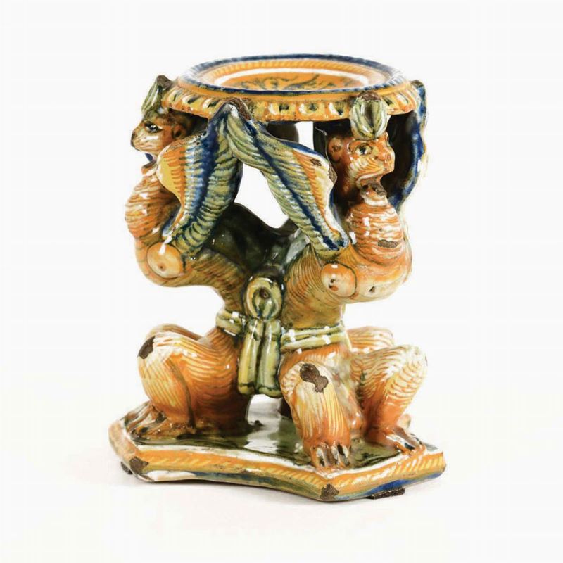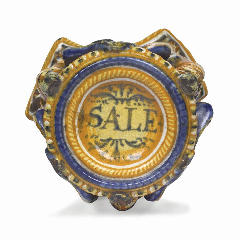 Maiolica Altezza cm 16; diametro vaschetta portasale cm 10; lato base max cm 14 Cadute di smalto, lievi mancanze visibili Provenienza: collezione privata