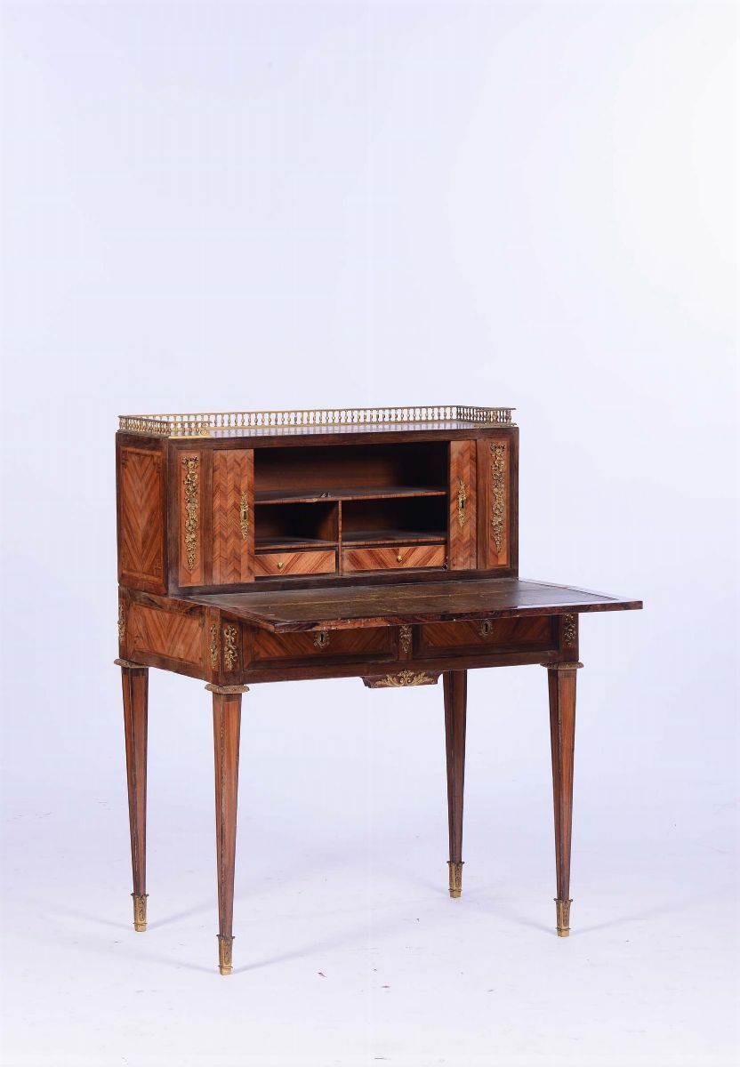 Bonheur du jour Luigi XVI lastronato in noce e bois de rose, Francia, fine XVIII secolo