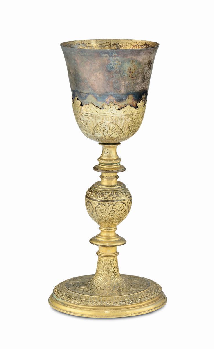 Calice in rame dorato e cesellato con coppa in argento dorato, Italia, XVII secolo