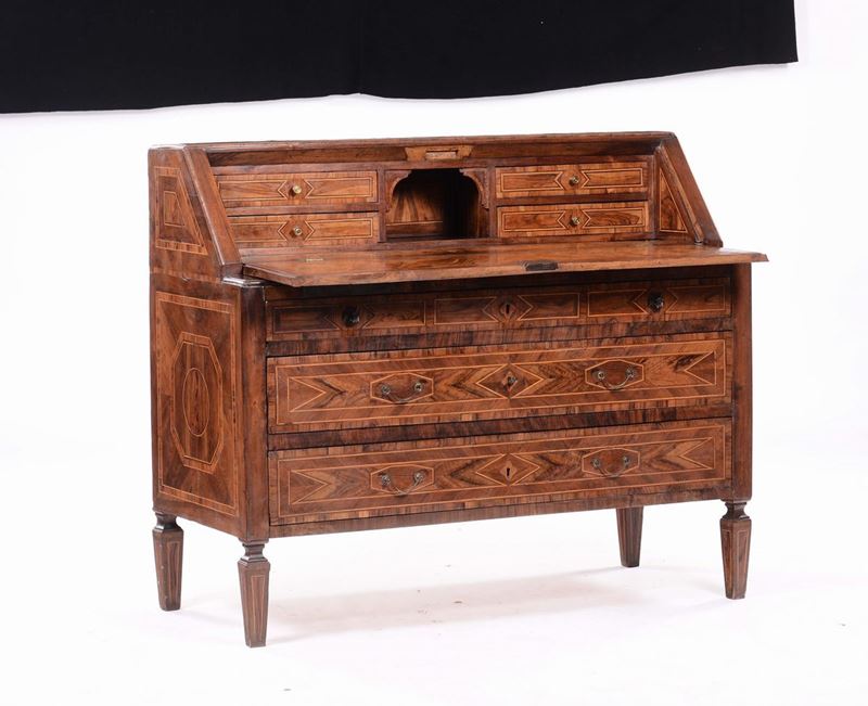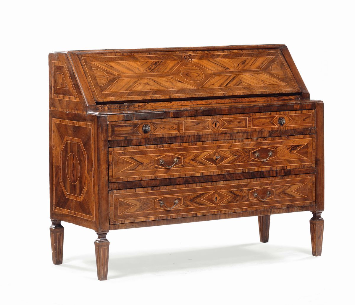 Cassettone a ribalta in noce, radica e altri legni, Italia settentrionale, fine XVIII secolo