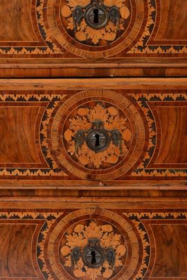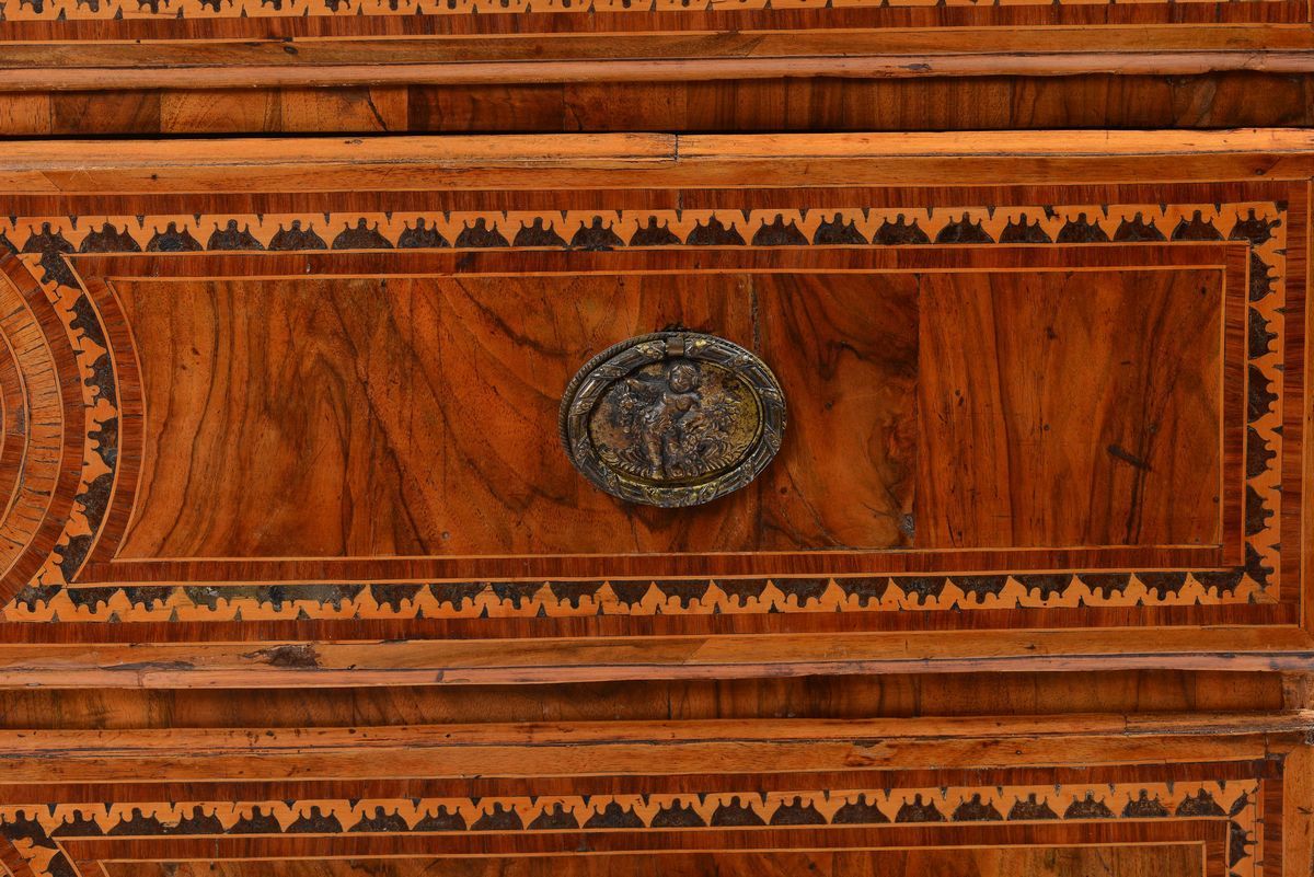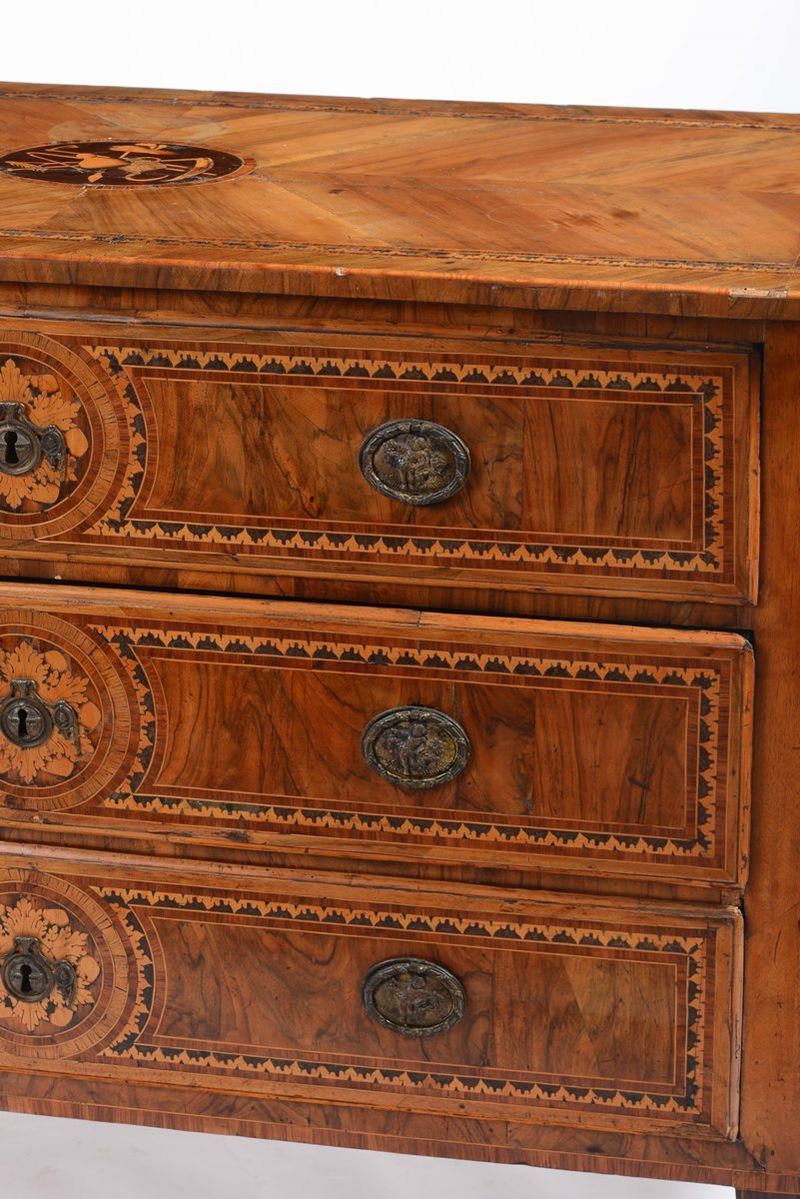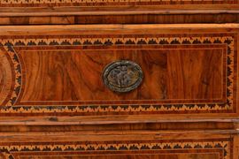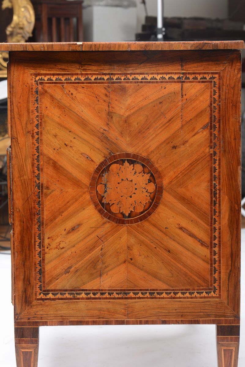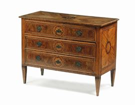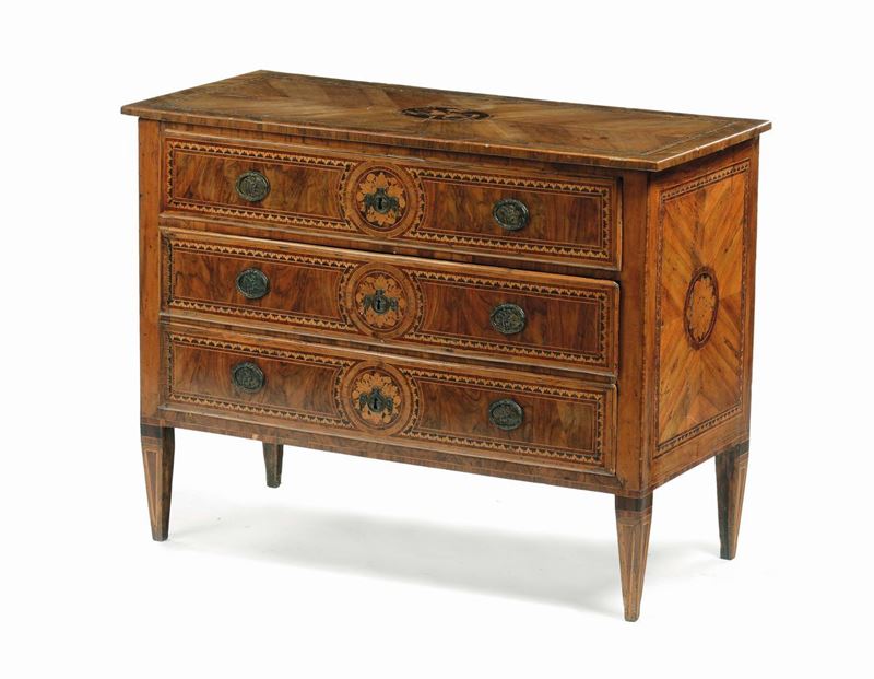 Comò Luigi XVI a tre cassetti lastronato e filettato, XVIII secolo
