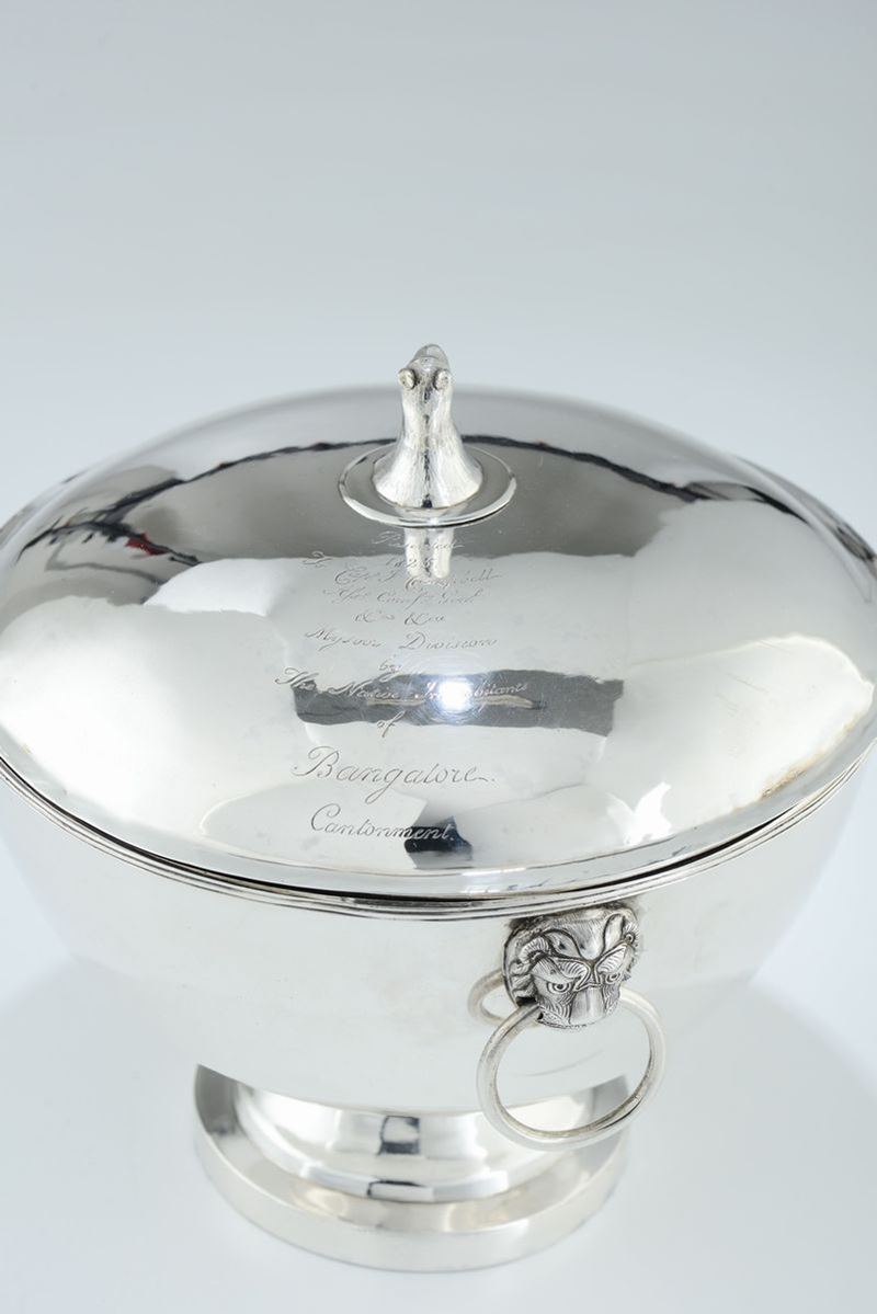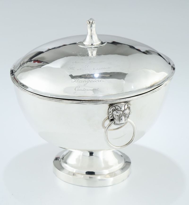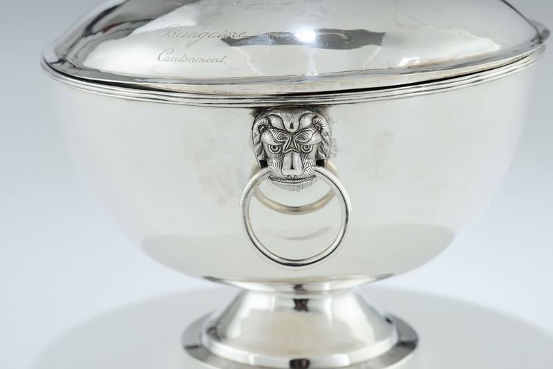 corpo globulare poggiante su piede circolare, sui lati teste di leone e presa con testa di animale, sul coperchio iscrizione incisa commemorativa in inglese con data 1828.gr. 1435, altezza cm 24, diametro cm 24