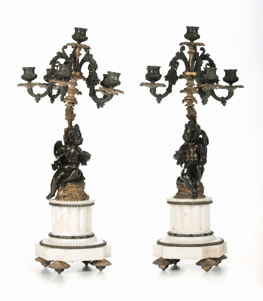 Coppia candelabri in bronzo, bronzo dorato e marmo, Francia, fine XIX secolo