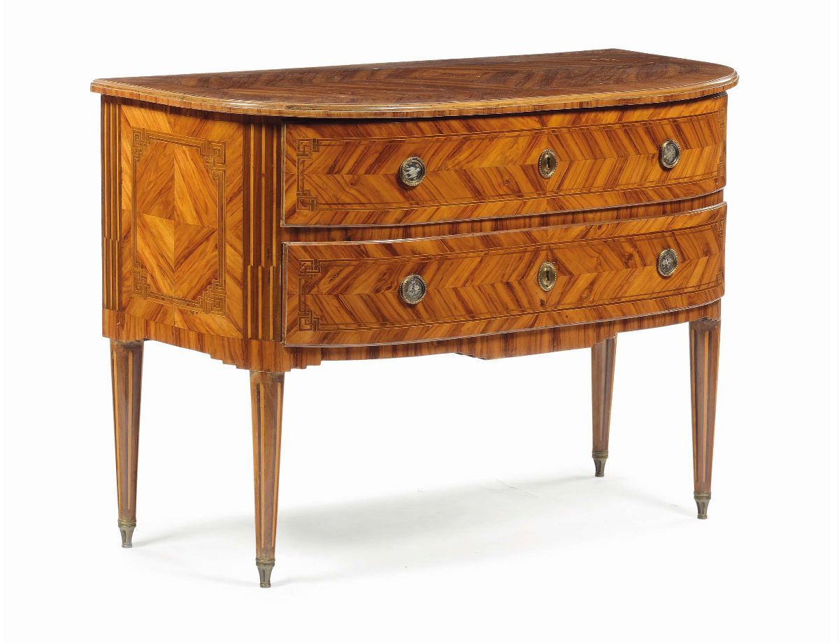Coppia di comò lastronati ed intarsiato a due cassetti, XVIII secolo