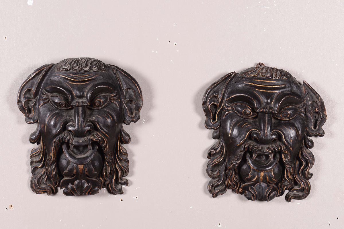 Coppia di mascheroni in legno intagliato e laccato, XVII secolo