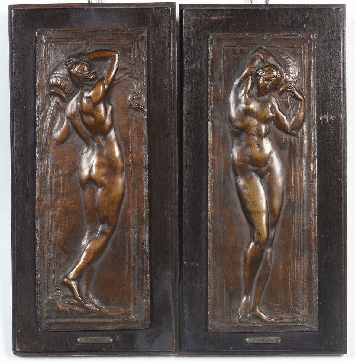 Coppia di placche in bronzo con figure femminili siglate Pogliaghi