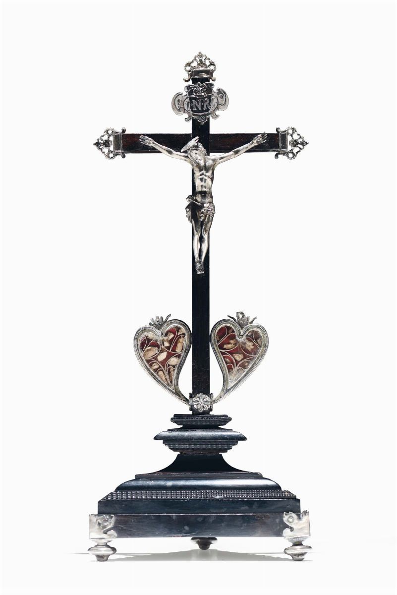 Crocifisso in legno ebanizzato con finimenti in argento sbalzato e figura di Cristo in argento, Italia centrale inizi XVIII [..]