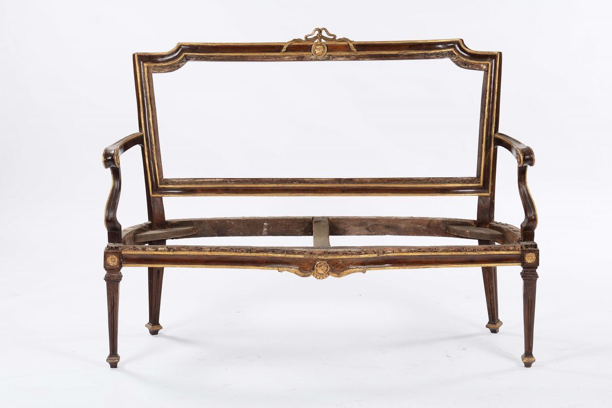 profili dorati, fascia inferiore e superiore centrate da profili maschili dorati, mancante di seduta e schienale, cm 130x55x97 (difetti)