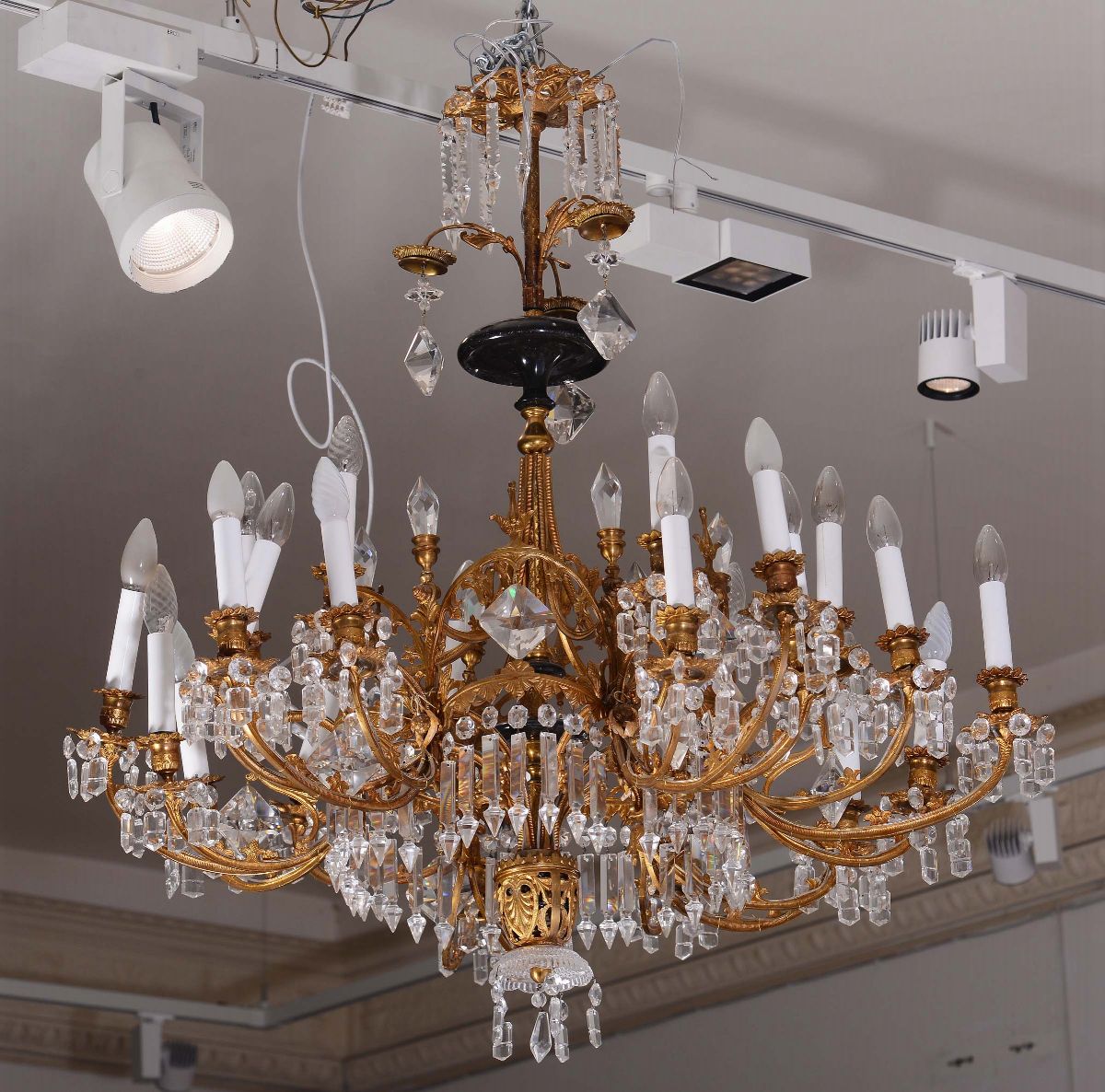 Lampadario a ventiquattro luci in bronzo e cristallo