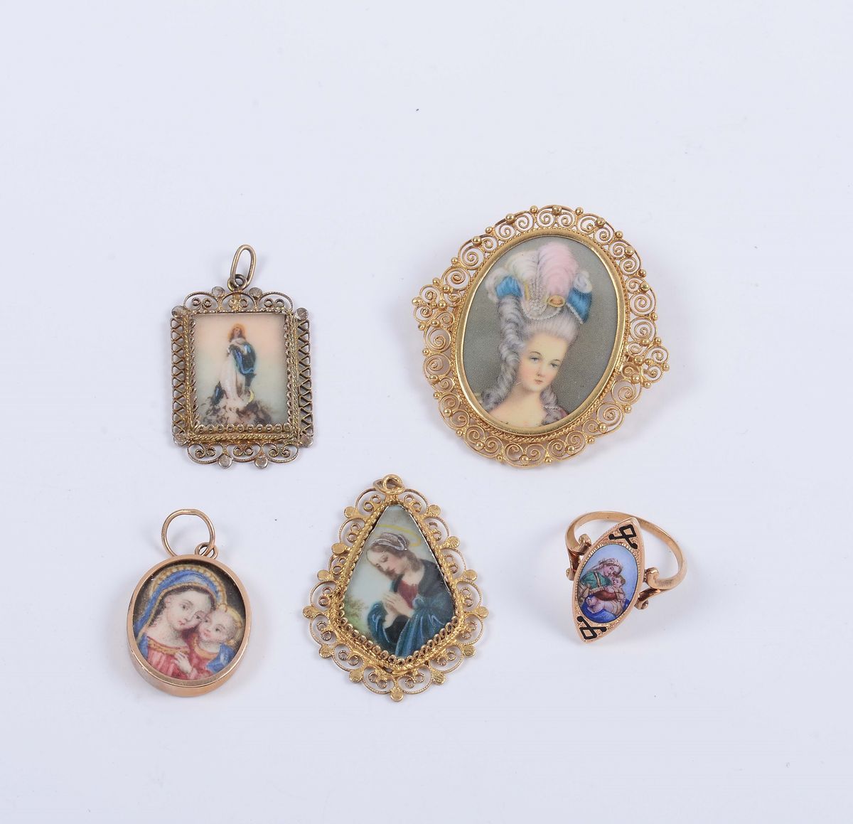 Lotto comprendente anello, spilla, 3 pendenti miniature smalti oro e filigrana dorata