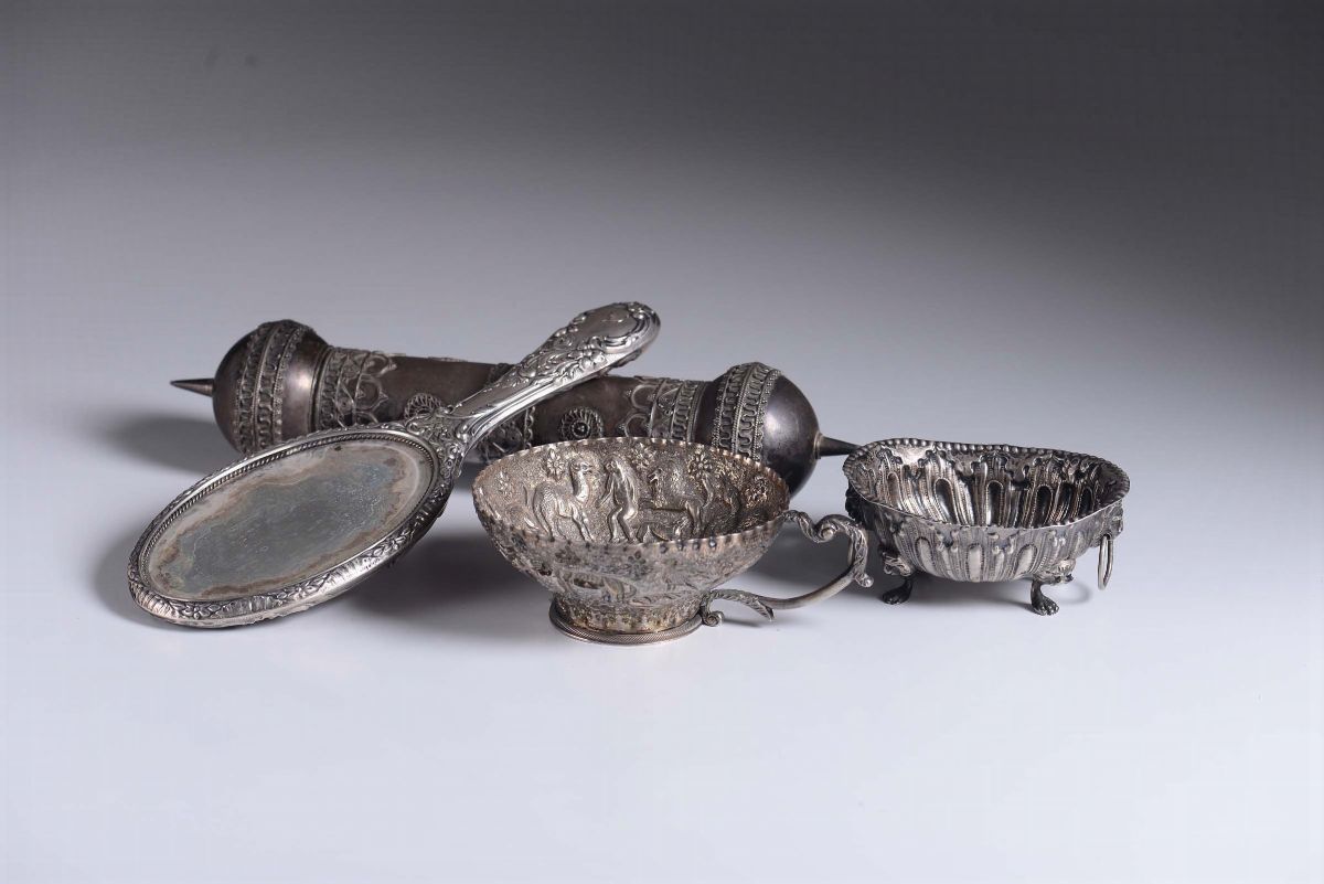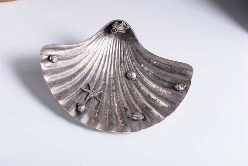 antico centrotavola, portapergamena, specchio inglese, coppa con animali a sbalzo e traccia del vecchio saggio, centrotavola a conchiglia