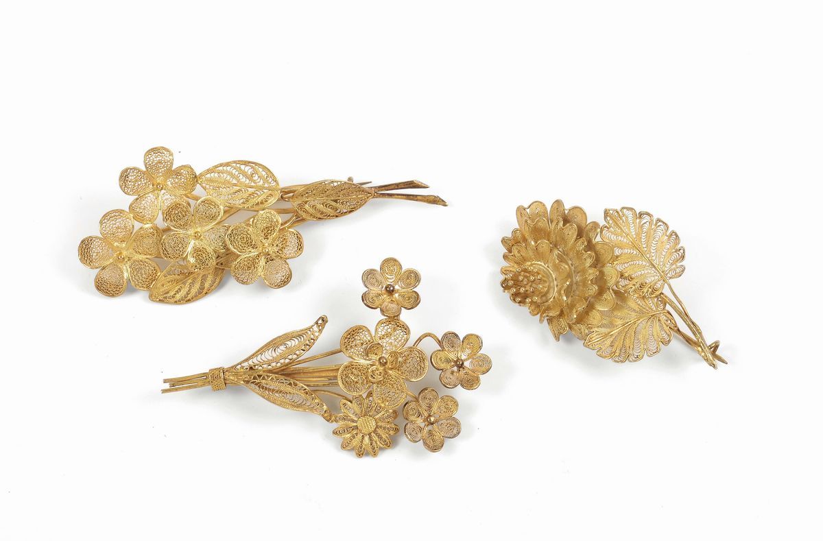 Lotto di tre spille floreali in filigrana