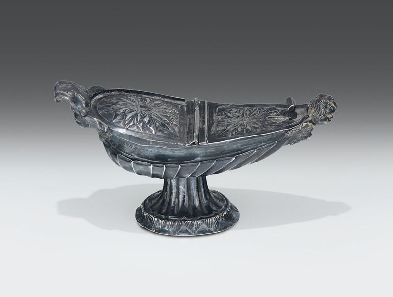 Navicella in argento fuso, sbalzato e cesellato, probabilmente Napoili fine XVIII - inizio XIX secolo (apparentemente priva di punzonatura)