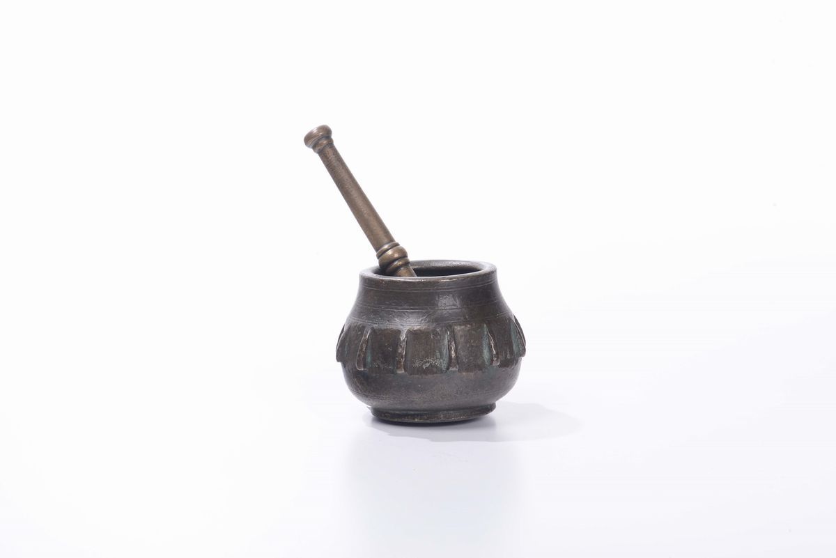 Piccolo mortaio costolato in bronzo con pestello a rocchetto, XVI-XVII secolo