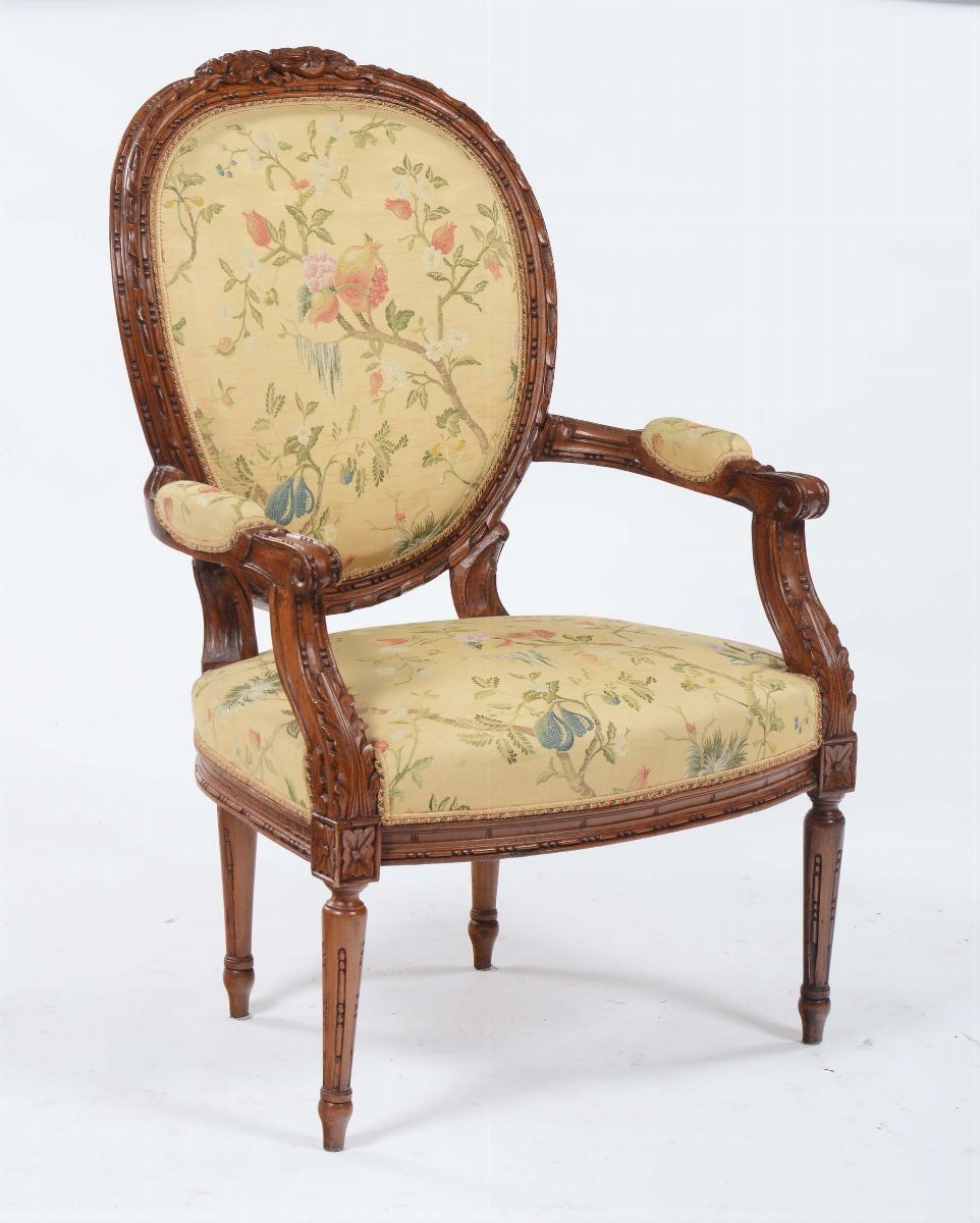 Poltrona in legno intagliato con tessuto floreale, XIX secolo