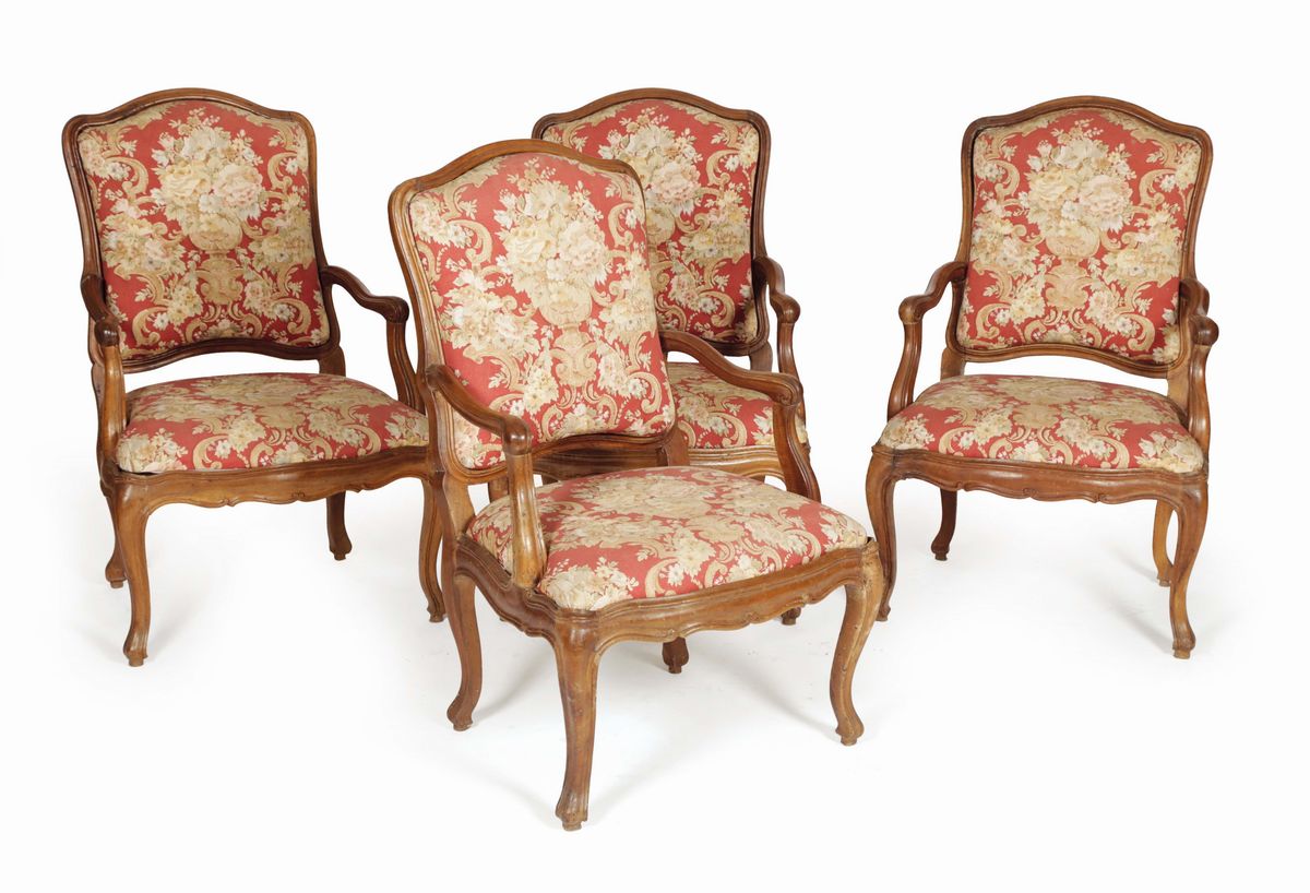 Quattro poltrone in stile Luigi XV in noce, XIX secolo